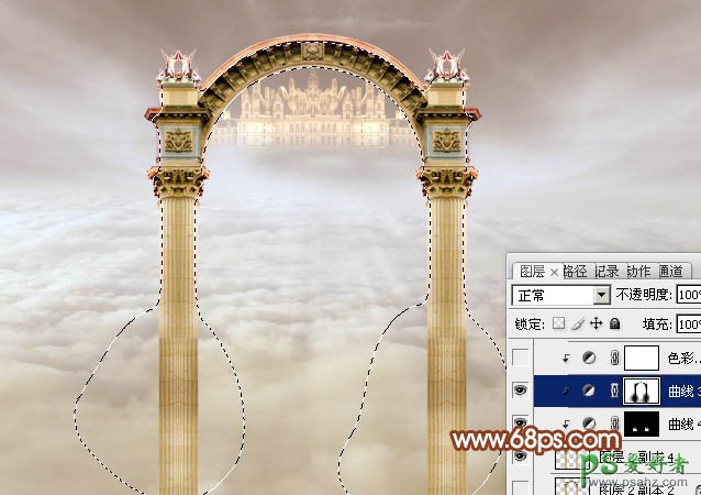 15、调出拱门选区,选择菜单:选择 > 修改 > 收缩,数值为2,然后把选区稍微往下移动几个像素,再按Ctrl + Shift + I 反选,然后创建曲线调整图层,参数设置如图27。底部不需要调色的部分用黑色画笔擦出来,再按Ctrl + Alt + G 创建剪贴蒙版。