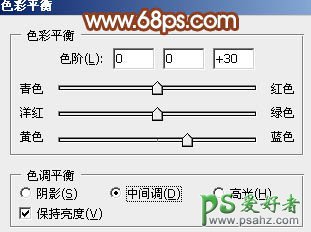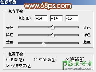 16、创建色彩平衡调整图层,对中间调,高光进行调整,参数设置如图28,29,确定后按Ctrl + Alt + G 创建剪贴蒙版,效果如图30。如果亮度不够的话可以把当前图层复制一层,适当降低图层不透明度。