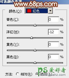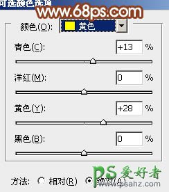 23、创建可选颜色调整图层,对红,黄进行调整,参数设置如图40,41,确定后按Ctrl + Alt + G 创建剪贴蒙版,效果如图42。