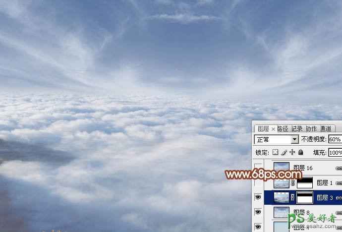 3、打开云朵素材,拖进来,适当放好位置,添加图层蒙版,用黑色画笔把顶部过渡擦出来,图层不透明度改为:60%,效果如下图。