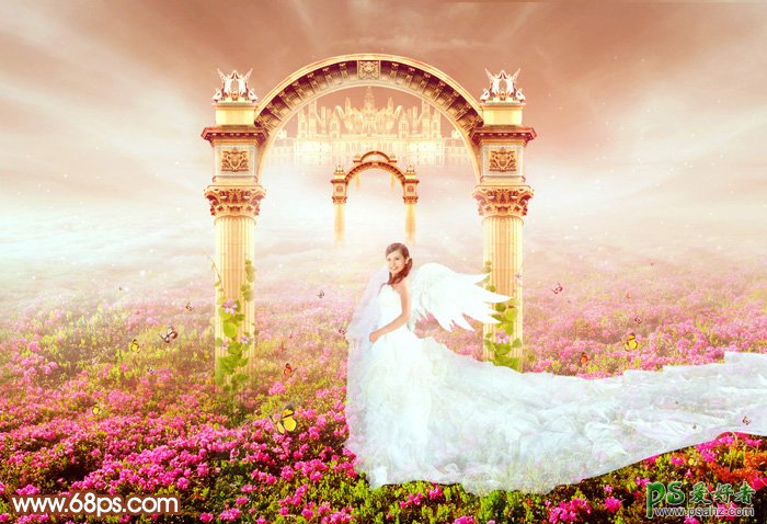 今天我们来学习一篇PS美女婚片调色教程实例,PS调出暖色调圣洁天使婚纱照,美女婚纱写真照,天使婚片的前期构思非常重要,我们可以把天使与圣殿,天使之门等联系起来。然后再整理素材,找到灵感后再慢慢构图,尽量用纯美,梦幻的效果来表现画面。最终效果