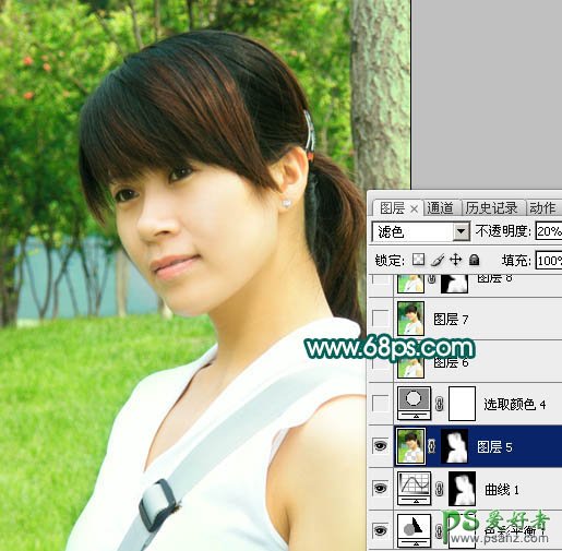 9、新建一个图层,盖印图层。执行:滤镜 > 模糊 > 高斯模糊,数值为5,确定后把图层混合模式改为“滤色”,图层不透明度改为:20%,加上图层蒙版,用黑色画笔把背景部分擦出来,效果如下图。