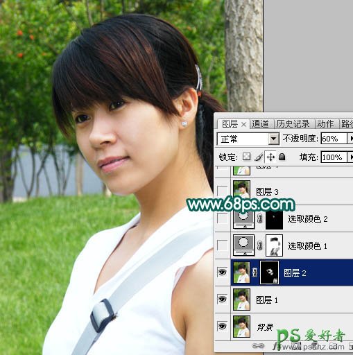 2、新建一个图层,按Ctrl + Alt + Shift + E 盖印图层。执行:滤镜 > 模糊 > 高斯模糊,数值为5,确定后按住Alt 键添加图层蒙版,然后用白色画笔涂抹人物脸部不光滑的部分,给人物磨皮。磨皮后把图层的不透明度改为:60%,这样可以保持脸部的毛孔细节,效果如下图。