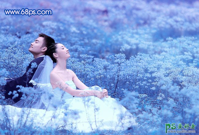 PS给田野中的情侣婚片调出纯美梦幻蓝色调