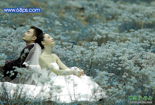 PS给田野中的情侣婚片调出纯美梦幻蓝色调
