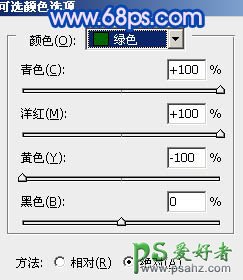 2、创建可选颜色调整图层,对绿色调整,参数设置如图4,效果如图5。