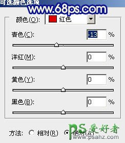 14、创建可选颜色调整图层,对红色调整,参数设置如图20,效果如图21。