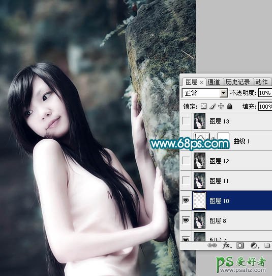 13、新建一个图层,盖印图层,按Ctrl + Shift + U 去色,图层不透明度改为:10%,效果如下图。