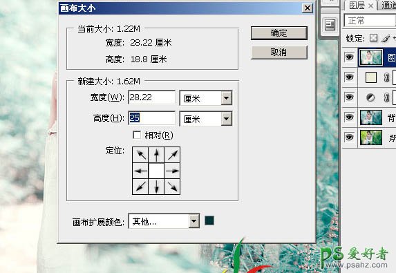 7、执行图像—画布大小,扩展画布,在高度那里输入扩展的数值,画布扩展颜色选其它,根据自已想的颜色来设置。