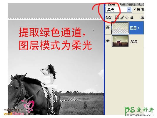 7、新建一个图层,按Ctrl + Alt + Shift + E 盖印图层。按Ctrl + Alt + 2 调出绿色通道高光选区,按Ctrl + J 把选区部分图像复制到新的图层,图层混合模式改为“柔光”。