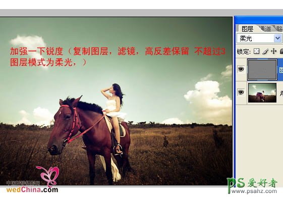 > 其它 > 高反差保留,数值不超过3,确定后把图层混合模式改为“柔光”。