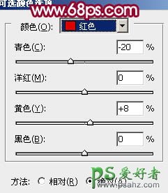 5、创建可选颜色调整图层,对红色及青色调整,参数设置如图11,12,效果如图13。