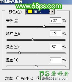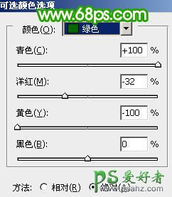 1、打开原图素材,创建可选颜色调整图层,对黄,绿调整,参数设置如图1,2,确定后用黑色画笔把人物部分擦出来,效果如图3。
