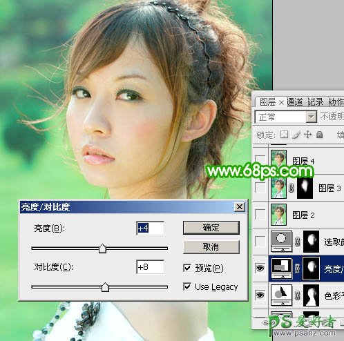 5、用套索工具勾出脸部的选区,按Ctrl + Alt + D 羽化5个像素后长街亮度/对比度调整图层,参数及效果如下图。
