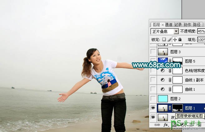 1、打开原图素材,把背景图层复制一层,图层混合模式改为“正片叠底”,图层不透明度改为:45%,按住Alt 键添加图层蒙版,用白色画笔把需要加强的部分擦出来,如下图。