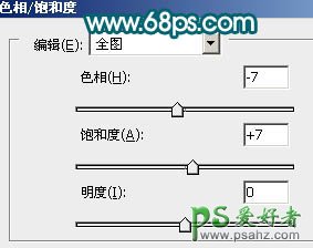 4、创建色相/饱和度调整图层,对全图调整,参数设置如图7,效果如图8。