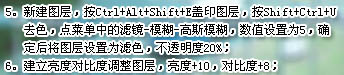 5、新建一个图层,盖印图层。按Ctrl + Shift + U 去色,执行:滤镜 > 模糊 > 高斯模糊,数值为5,确定后把图层混合模式改为“滤色”,图层不透明度改为:20%。 6、创建亮度/对比度调整图层,数值:亮度:+10,对比度:+8。
