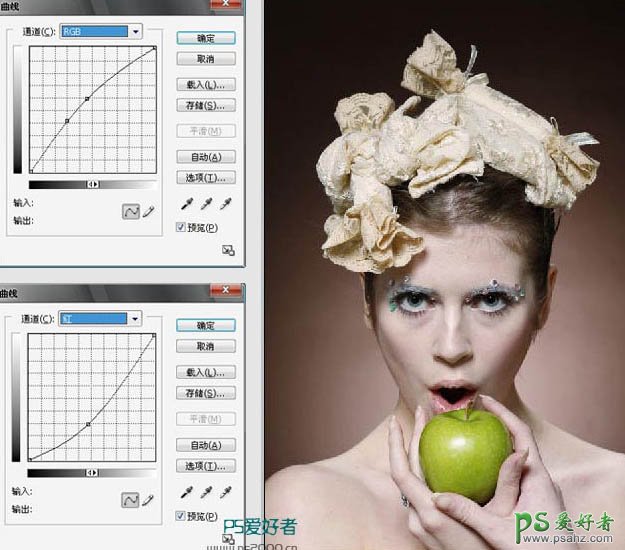 2、回到图层面板,创建曲线调整图层,对RGB及红色调整,参数及效果如下图。
