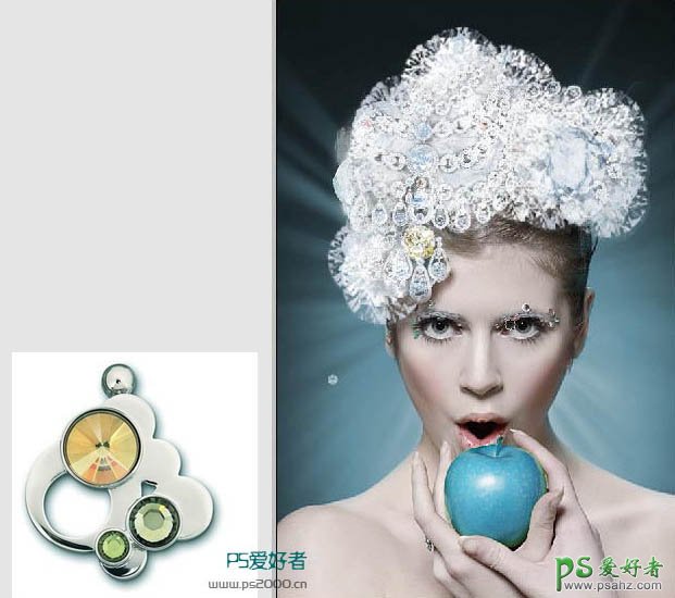 10、这一步再找一个饰品素材,抠出中间像钻石的部分,拖到我们制作的图中,再对其进行着色,以适应环境。