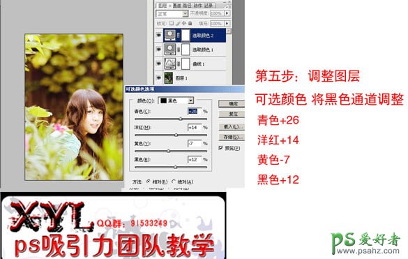 5、创建可选颜色调整图层对黑色调整,数值:青色:+26,洋红:+14,黄色:-7,黑色:+12。