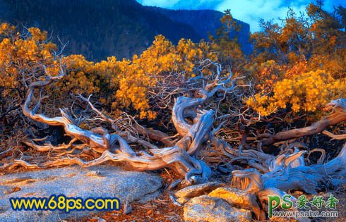 PS风景艺术照调色教程,PS调色教程:打造清新色彩风景艺术照特效,本教程的色调有点类似黄昏后的效果。调色的过程也比较简单。开始的时候我们需要把素材图的整体色调压暗,然后开始换色,把黄绿色调成鲜艳的橙黄色,白色部分调成蓝色,再协调好整体颜色皆