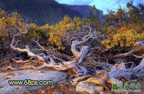 PS风景艺术照调色教程,PS调色教程:打造清新色彩风景艺术照特效,本教程的色调有点类似黄昏后的效果。调色的过程也比较简单。开始的时候我们需要把素材图的整体色调压暗,然后开始换色,把黄绿色调成鲜艳的橙黄色,白色部分调成蓝色,再协调好整体颜色皆