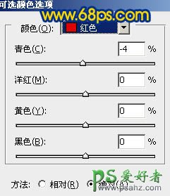 6、创建可选颜色调整图层,对红,黄,蓝进行调整,参数设置如图16 - 18,效果如图19。