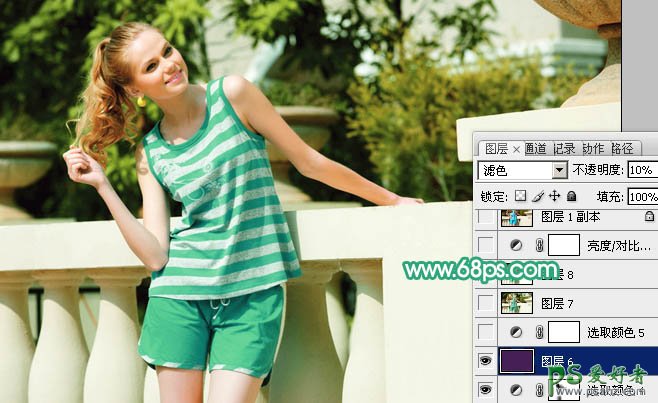 10、新建一个图层,填充颜色:#462054,图层混合模式改为“滤色”,图层不透明度改为:10%,效果如下图。