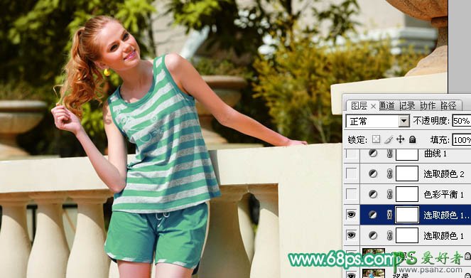 2、如果觉得衣服色彩还不好看的话把当前的可选颜色图层复制一层,图层不透明度改为:50%,如下图。