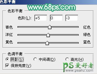 3、创建色彩平衡调整图层,对暗调及中间调进行调整,参数设置如图7,8,效果如图9。