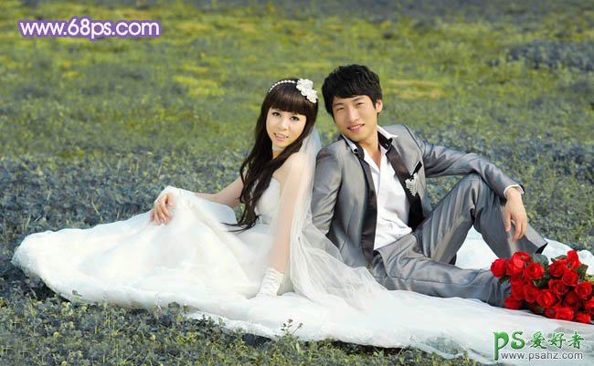 PS调色教程:给草地上的情侣婚纱照调出淡紫艺术色