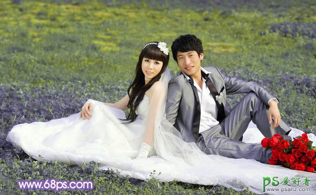PS调色教程:给草地上的情侣婚纱照调出淡紫艺术色