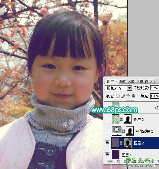 4、按Ctrl + Alt + ~ 调出高光选区,新建一个图层填充颜色:#66526B,图层混合模式改为“颜色减淡”,图层不透明度改为:40%,加上图层蒙版,用黑色画笔把人物部分擦出来。
