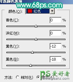 5、创建可选颜色调整图层,对红色及黄色进行调整,参数设置如图9,10,效果如图11。