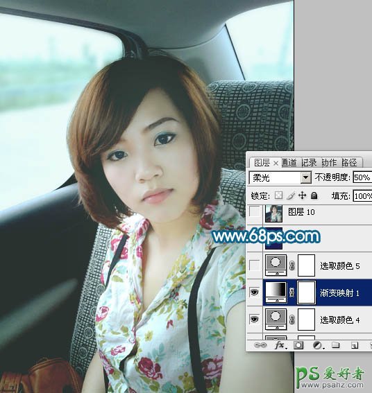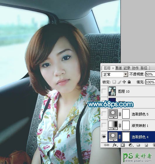 PS调色教程:给车内性感美女照调出柔美中性青色调