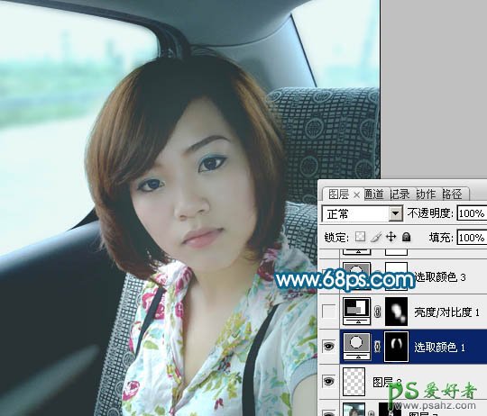 PS调色教程:给车内性感美女照调出柔美中性青色调