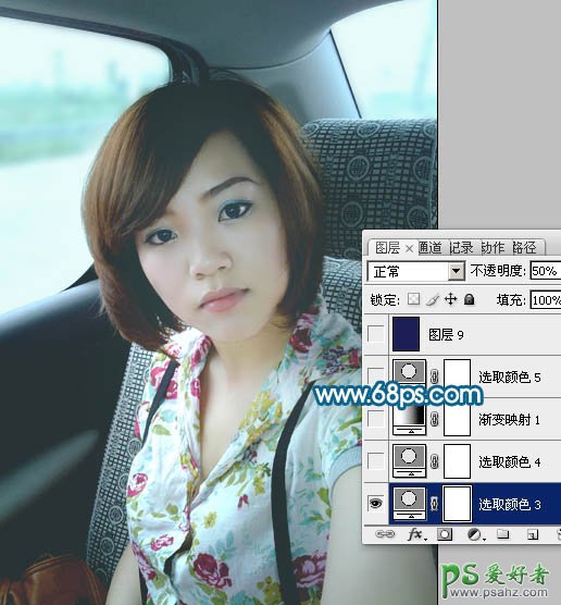 PS调色教程:给车内性感美女照调出柔美中性青色调