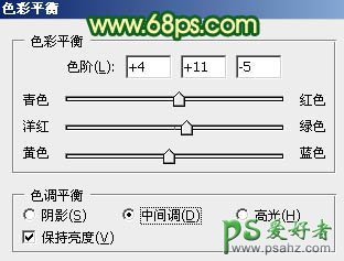 8、创建色彩平衡调整图层,对中间调进行调整,参数设置如图20,效果如图21。