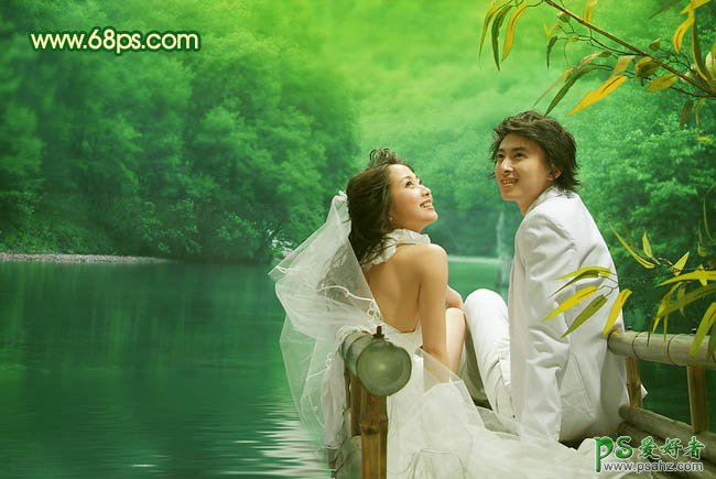 今天我们来学习一篇PS婚片后期调色教程,PS调色教程:调出清新绿色水景婚纱照,本教程介绍黄绿色婚片的调色方法。在调色的时候为了统一色调,我们需要把画面中一些绿植的色调进行特殊处理,形成视觉重心。同时把人物的色调也调成类似的,这样画面的层次就