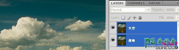 2、在photoshop原图素材,双击背景层命名为“道路”。Ctrl+J复制图层,命名为“天空”。