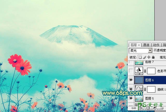8、新建一个图层填充颜色:#5D81A4,图层混合模式改为“柔光”,如下图。