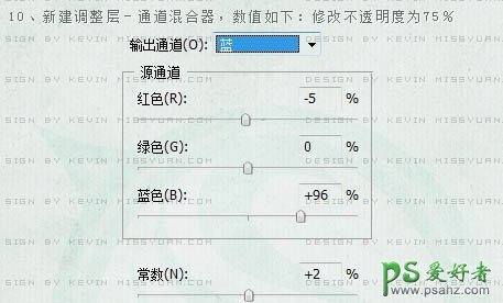 10、创建通道混合器调整图层,对蓝色调整,参数设置如下图,确定后把图层不透明度改为:75%。