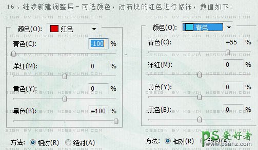 16、继续新建可选颜色调整图层,对石块的红色进行修饰,参数设置如下图。