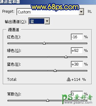 1、打开原图素材,创建通道混合器调整图层,对蓝色进行调整,参数设置如图1,效果如图2。这一步是快速把图片中的一些杂色消除。