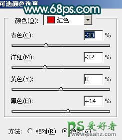 3、调出当前图层蒙版选区,创建可选颜色调整图层,对红,黄,绿调整,参数设置如图7 - 9,效果如图10。