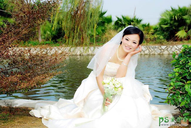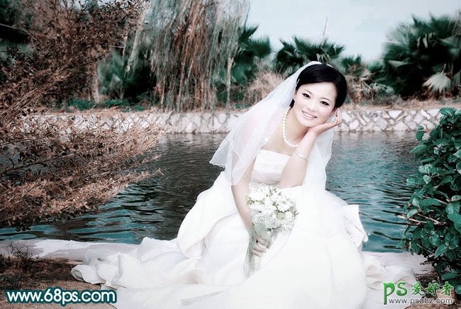 今天我们一起来和大家学习一篇PS婚片调色教程:打造柔情似水的漂亮美女水景婚纱照,漂亮美女婚纱艺术照调色,外景图片如果画面的色调构成比较复杂的话,调成中性色是个比较好的选择。因为中性色可以消除大部分的杂色。只保留淡淡的主色调,画面会感觉统一很多。调色的过程也比较简单:先用调色工具把主色调加强一下,然后降低画面的饱和度即可。