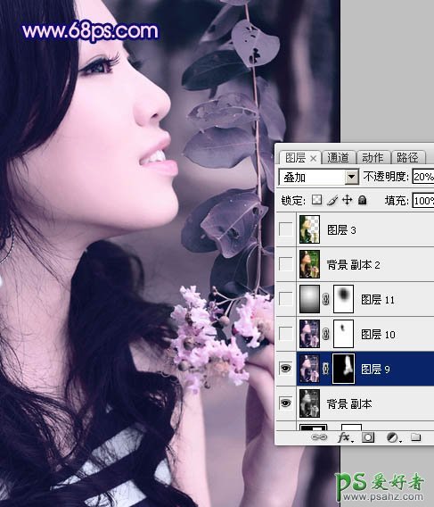 14、新建一个图层,盖印图层。图层混合模式改为“叠加”,图层不透明度改为:20%,按住Alt 键添加图层蒙版,用白色画笔把需要加强的部分涂出来,效果如下图。