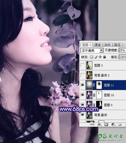 16、新建一个图层,选择渐变工具颜色设置为黑白渐变,由中心向四周拉出径向渐变。确定后把图层混合模式改为“正片叠底”,图层不透明度改为:25%,加上图层蒙版用黑色画笔把人物脸部擦出来,如下图。