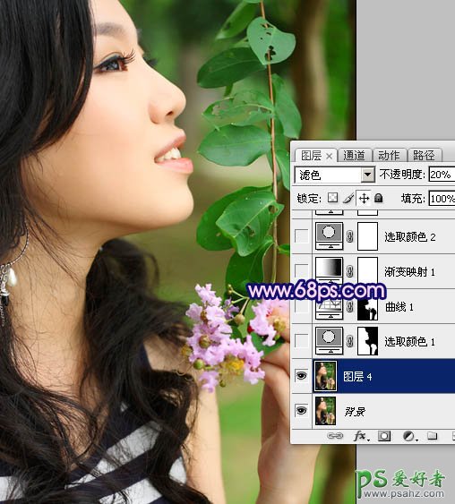 1、打开原图素材,按Ctrl + J 把背景图层复制一层,图层混合模式改为“滤色”,图层不透明度改为:20%,效果如下图。