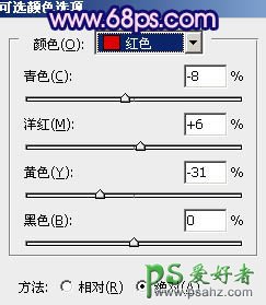 2、创建可选颜色调整图层,对红,黄进行调整,参数设置如图2,3,确定后只保留人物部分,其它部分用黑色画笔擦出来,效果如图4。